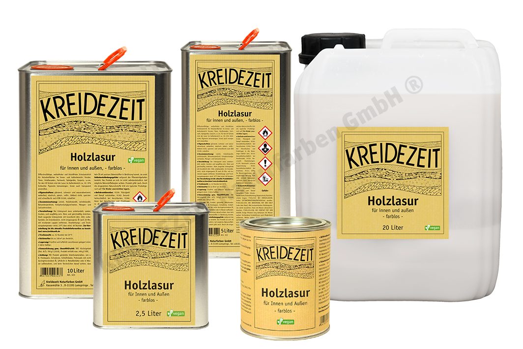 Kreidezeit Holzlasur ist ein diffusionsfähiger, biozidfreier Schutzanstrich für Holzoberflächen im Innen- und Aussenbereich: z.B. Fenster, Türen, Holzfassaden, Fachwerk, Spielgeräte, Zäune, Gartenmöbel, Carports, uvm. Kreidezeit Holzlasur blättert, platzt bzw. reißt nicht sondern wittert oberflächlich allmählich ab und ist durch einfaches Reinigen und Überstreichen renovierbar. Im Aussenbereich sind der Holzlasur lichtechte Pigmente zuzusetzen, welche die natürliche Holzmaserung farblich ästhetisch betonen, guten UV Schutz gewährleisten und vor Vergrauung des Holzes und frühzeitiger Abwitterung schützen. Im Innenbereich kann die Holzlasur farblos verarbeitet werden