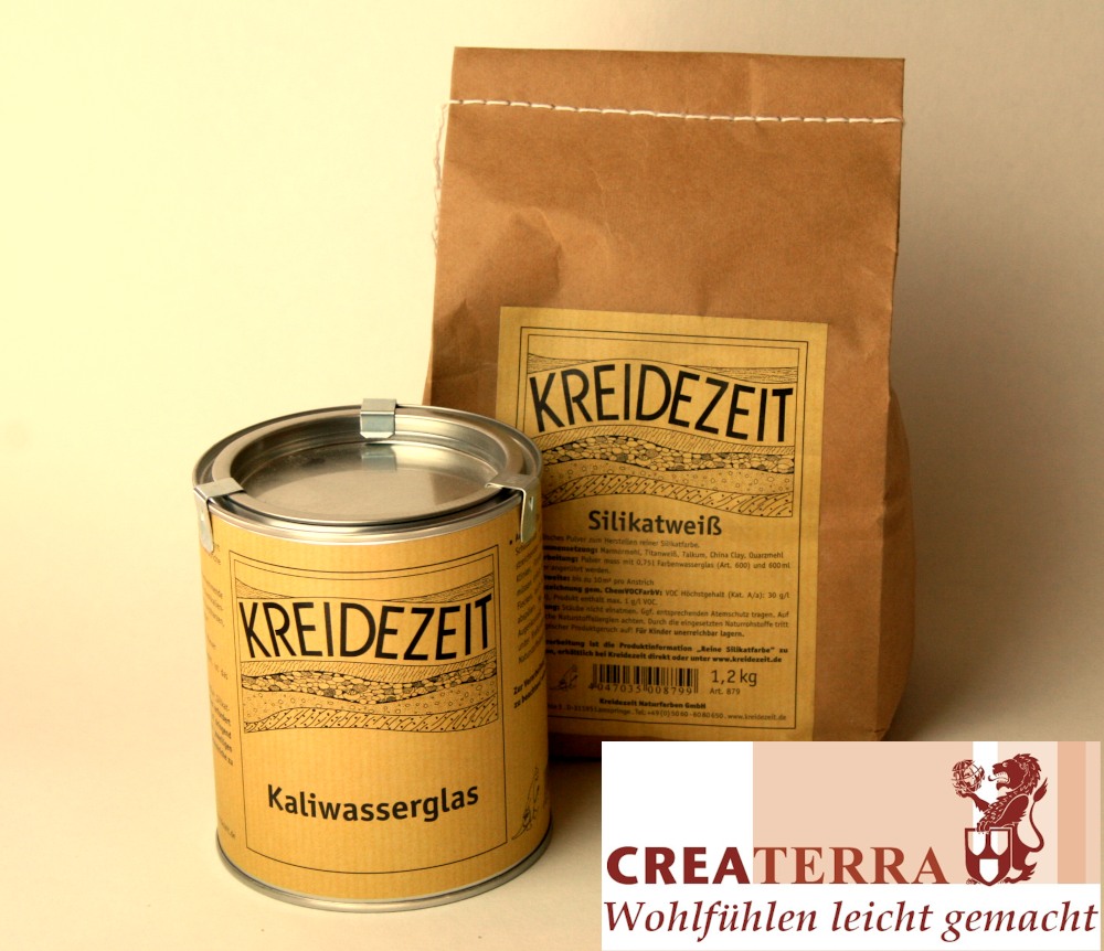 KREIDEZEIT Silikatfarbe ist ein zweikomponentiges Anstrichsystem, dass sich aus 2 KREIDEZEIT Produkten zusammensetzt: